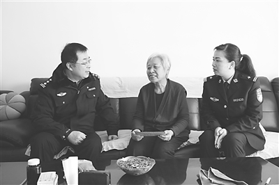 2005年8月,在高速交警定州大队工作的李飞在路上处理一起交通事故时,被疾驰而来的汽车撞个正着,牺牲时年仅28岁。李飞的父亲几年前离世,家中只剩下老母亲一个人。见到“送暖”民警,老人非常欣慰(图②)。