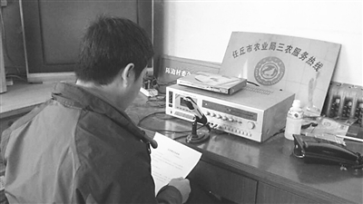 图为任丘市辛中驿镇陈边村反邪教宣传员正在向村民广播反邪教知识。