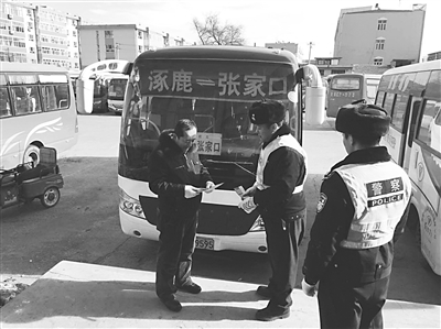 春运期间,高速交警涿鹿大队民警走进客运企业、服务区、辖区村庄等场所,开展面对面宣传,通过重特大事故案例教育和引导,让广大群众尤其是驾驶员“零距离”接受交通安全法律法规教育,自觉遵守交通法律法规。图为民警在对客运驾驶员进行宣传。