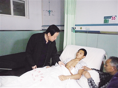 3月2日,孟繁浩在医院看望慰问勇斗歹徒、身受重伤的见义勇为人员宋龙涛。