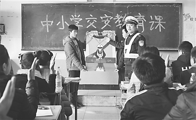 为强化中小学生道路交通安全知识,霸州市交警大队与辖区各中小学校联合组织开展了“中小学生道路交通安全课”活动,受到学生及家长的好评。图为该大队胜芳中队民警在胜芳北环路小学进行道路交通安全宣教。 杜岩龙 摄