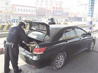 为保障全国两会期间首都安全,自3月1日零时起,香河安平公安检查站启动一级勤务,加大对进京非京牌车辆的安检力度。执勤民警严格盘查,充分利用单警装备、搜爆仪、防爆毯、金属探测仪等科技装备,进行有效查控,决不让一枪一弹、一件危险物流入北京,切实发挥首都“护城河”和“过滤网”的作用。截至目前,香河共投入警力162人次,检查进京车辆4198辆、人员7206名,收缴假牌1副、烟花4000头、管制刀具1把。图为检查站执法人员在检查进京车辆。