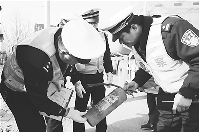 图为民警对灭火器进行检查。