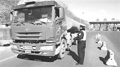 近来,出行的车辆越来越多。为给出行的人们创造良好的道路交通环境,高速交警鹰手营子大队进一步加强客运车辆和危险品车辆的检查登记工作。图为3月6日,民警对通过辖区的一辆危险品车辆进行安全检查。 齐鸣 摄