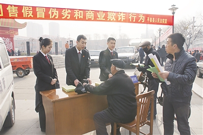 为增强消费者的法律维权意识,3月15日,平泉县人民法院在县中心广场悬挂横幅,设置咨询台,抽调3 名干警为现场群众提供法律咨询。干警们向群众发放“诉讼风险告知书”,并讲解食品安全、预防商业欺诈、网购的权益保护等方面的法律知识,帮助群众增强防范意识,耐心接受群众咨询,受到在场群众一致好评。图为活动现场。