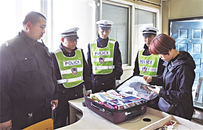 4月1日下午,一辆出租车在行驶中后备厢内掉下一个皮箱,正在路口执勤的廊坊市交警二大队三名协警得知这一情况后,立即找到皮箱,发现箱内有一些生活用品及银行卡、会员卡、购物卡等。三名协警通过会员卡上的信息,最终在一家美发店找到了失主的电话号码并联系上了失主。图为失主核对皮箱和钱包里的物品。