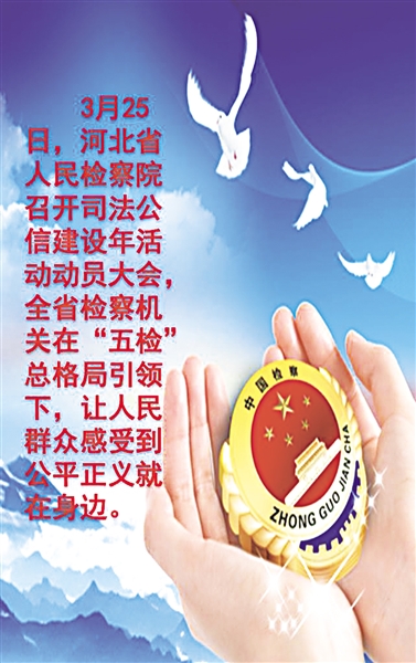 3月25日,河北省人民检察院召开司法公信建设年活动动员大会,全省检察机关在“五检”总体工作布局引领下,开展为期一年的司法公信建设年活动,努力让人民群众在每一个司法案件中都感受到公平正义。