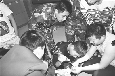 4月3日22时14分,石家庄市鹿泉区一名青年李某手指被一枚钛金戒指卡住,出现肿大状况并已经勒出伤口,不断地滴着血。接到求助,石家庄市鹿泉区消防大队救援人员尝试先用电锯将戒指锯开,再用尖嘴钳子将戒指取下。十几分钟后,卡在手指上的戒指被取下。4月8日,李某将一面锦旗送到消防大队,表达谢意。图为救援现场。