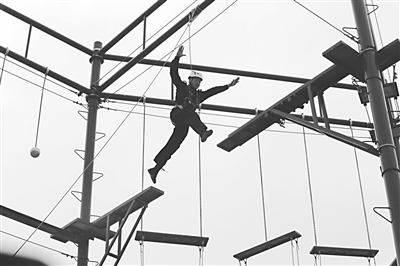 为进一步提高“警务实战化”训练水平,石家庄市公安局长安分局组织100余名民警开展了 “军营特别训练”活动。他们借助部队院校师资力量和训练专业的优势,对心理压力缓解辅导、队列训练及指挥、伤病人员紧急救护、体能拓展训练、手枪分解、射击理论讲解等内容,进行了系统的培训。图为民警在进行体能拓展训练。 张健 摄