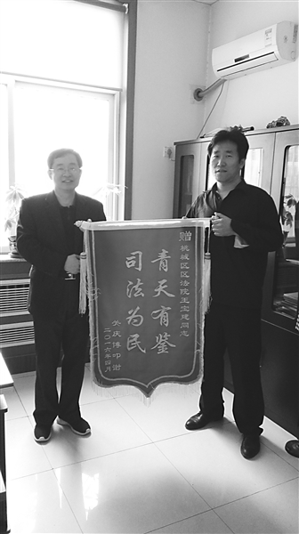 本报讯 (记者 张兰华)4月19日上午8时40分,当事人关庆博兴冲冲地来到了桃城区人民法院立案庭,送来写着“青天有鉴 司法为民”的锦旗。