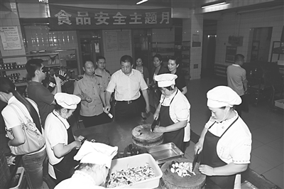 图为省会食品药品监督管理局工作人员检查学校食堂。