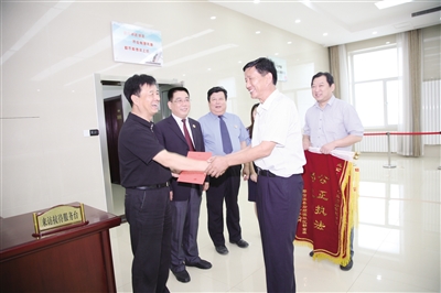 上图:日前,胡金林带着锦旗和感谢信来到省检察院表达感激之情。时任省检察院副检察长、现为省检察院正厅级检察员周庆平(左一)代表童建明检察长热情接待了胡金林。