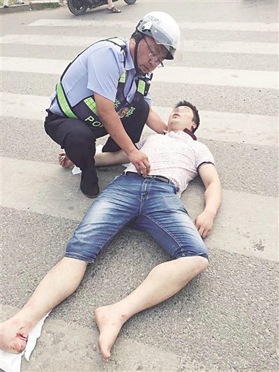 医生随后要求将伤者头部放平,但不能着地。刘鹏赶忙蹲下,用手悬托着伤者头部。当时的气温已逐渐升高,烈日下的路面滚烫,煎烤着刘鹏的手臂。尽管大汗淋漓,他却一动不动,悬托着伤者的头部,在烈日下坚持了20分钟。