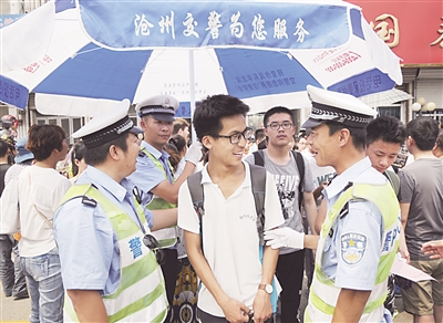 6月21日,中考第一天,骄阳似火,沧州市交警二大队民警冒着高温疏导交通秩序,保证考生出行安全。当日上午11时20分,沧州市区车站小学考点前,执勤民警为走出考场的学生们撑伞遮阴。 孙明山 摄