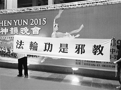 2015年3月,“神韵晚会”在台南文化中心上演,未料遭到当地民众呛声。部分民众在场馆前广场打出醒目横幅:“停止行销法轮功神韵文化”、“法轮功不要欺骗台湾人”、“神韵晚会滚出台湾”。此前,“神韵晚会”曾在高雄市文化中心上演。开演前,亦有民众在高雄文化中心广场,以及神韵晚会巨幅海报前打出“神韵演出是邪教文化”等醒目横幅进行呛声。抗议民众的标语直接点出神韵演出具有“法轮功”邪教背景,以提醒台湾民众,远离“法轮功”。