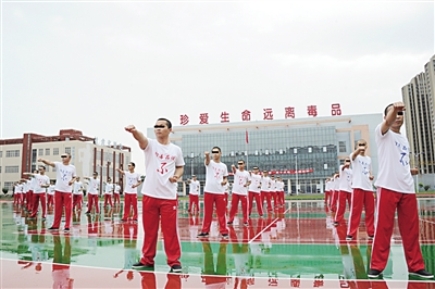 “我们要向毒品说不!”嘹亮的声音回荡在广场上空。6月23日,天空虽然飘着小雨,但在石家庄市第二强制隔离戒毒所的操场上,戒毒人员整齐列队,热情高涨。他们穿着印有“向毒品说不”的红色T恤衫,集体背诵《弟子规》,表演武术操、长拳、太极拳。他们充满活力的表演展示出他们的积极乐观,他们正用自己的方式向毒品说不!