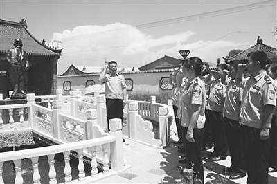 “七一”前夕,涿鹿县公安局党委书记、局长夏德新带领局党委班子成员及该局机关一支部全体党员,赴“两学一做”红色教育基地——丁玲纪念馆开展“重温入党誓词、深入践行‘两学一做’学习教育”专题党日活动。民警们先后参观了丁玲纪念馆及农民文化站,认真学习了丁玲坐炕头、蹲地头、进心头的“三头”群众工作法。他们表示要以丁玲为榜样,以党章为准则,以实际行动为党旗增光添彩。 马丽斌 摄