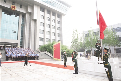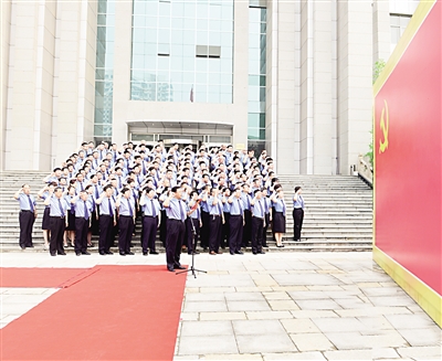 为使集体重温入党誓词这一仪式更加庄严隆重,廊坊市检察院特意制作了巨幅党旗画作,并邀请武警廊坊市支队8名战士护升国旗(见上图)。庄严的仪式,再度激发了全院检察干警为党旗增辉、为国旗添彩、为人民建功的壮志豪情。