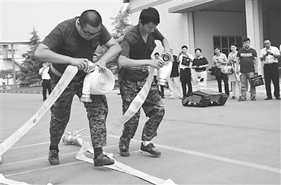 石家庄市鹿泉区公安消防大队紧密结合当地仓储物流多、食品加工企业多、大型住宅社区多的特点,全力打造工业企业型和社区联防型微型消防站,截至目前,他们已高标准建成微型消防站38家,覆盖率达100%。图为6月28日,在鹿泉区微型消防站现场观摩会上,石家庄君乐宝乳业有限公司微型消防站消防队员在进行25米消防水带连接表演。 本报记者 韩志强 摄