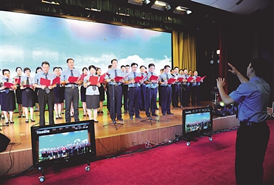 图为省检察院党组成员、唐山市检察院检察长曲波等领导班子成员与干警们一起高歌颂党的场面。 王巍 摄