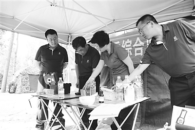 此次演练以重大自然灾害传染病疫情处置和饮用水污染处理为背景,本着“高度重视、周密组织、贴近实战、注重实效”的原则,重点演练了指挥调度与队伍集结、营地搭建与后勤保障、饮水安全与突发急性传染病防控、野外生存与体能训练等内容。通过理论培训、快检设备操作、实战案例应急处置相结合的演练方式,检验应急预案的可行性和有效性,积累实战经验,提升综合业务水平。图为工作人员在对饮用水进行检测。 记者 刘小林 摄