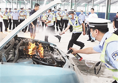 针对夏季汽车自燃事故时有发生的状况,沧州市交警二大队下辖中队的每辆警车上都配备了“灭火勇士”。执勤民警遇到汽车自燃等火灾事故时,可用“灭火勇士”第一时间控制火灾蔓延,精准扑灭火灾。图为7月6日上午,该大队民警利用“灭火勇士”进行汽车自燃灭火演练。 孙明山 摄