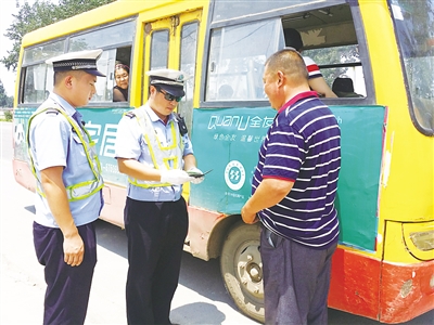 图为7月10日,民警对一辆通过辖区的公路客车进行安全检查。