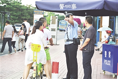 为确保游客安全,秦皇岛市公安局组建了旅游警察支队,和旅游监察支队、文化市场行政执法大队等一起,在全市重点路段和景区景点巡逻,综合协调处理旅游纠纷。旅游警察在对失窃、抢劫案件进行侦办的同时,还可以帮助快速恢复游客丢失的身份信息、个人信息以及帮助冻结银行卡等,为游客带来极大安全感。游客遇到旅游问题想投诉,可拨打12301、12345、110或者各县区的旅游投诉电话,旅游警察会第一时间到达现场受理解决。图为北戴河街头,旅游警察为游客提供服务。