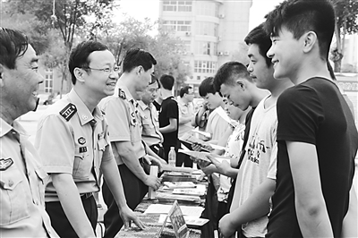 近期,新乐市征兵办为做好今年夏秋季征兵工作,积极开展征兵政策宣传进校园、进社区、进农村、进市场等活动,通过电视、广播车广播、发放宣传单、张贴征兵海报、现场讲解征兵政策等形式,大力宣传国家的征兵优待政策,鼓励广大农村青年、高中毕业生及高校毕业生踊跃报名参军。图为7月16日,新乐市人武部工作人员在该市文化广场进行征兵宣传。