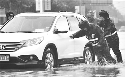 7月下旬,唐山市出现今年以来最强降雨。唐山市公安交警支队提前发布预警提示,广大交警顶风冒雨、指挥疏导。图为交警将一辆熄火轿车推出深水区。
