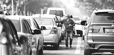 红绿灯路口,司机们刚把车停稳,就会有一个个手拿小广告的人从马路两边走到车流当中,或轻敲车窗或直接将小卡片插进车窗缝隙,待绿灯亮起,车流恢复涌动,这些人再次回到道路两侧,等待下一个红灯……