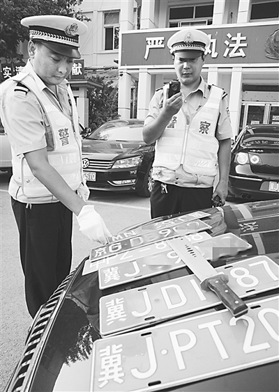 7月29日,沧州市公安交警二大队七中队民警巡逻值勤时,发现一辆轿车涉嫌套用其他车辆牌照,经检查,车辆后备厢内还有四副牌照和一把砍刀,民警立即将驾驶人控制,车辆暂扣,根据相关法律法规对驾驶人依法作出相应处理。 孙明山 摄