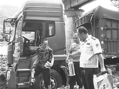 7月19日至20日,井陉县受到特大暴雨袭击,人民群众生命财产遭受严重损失。为确保灾后重建过程中全县道路安全畅通,该县公安交警大队全警动员,昼夜奋战在路面一线,疏堵保畅,积极参与搜救失踪人员,并与辖区道路沿线民众一同清理污泥,确保大型清污机械操作期间路面畅通有序及人员安全。图为民警向被困司机发放方便面。