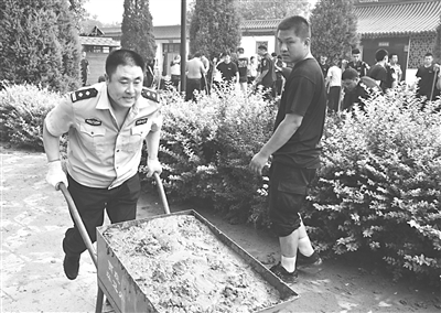 “7·19”洪灾后,石家庄市公安局矿区分局党委组织全局100余名民警赶赴灾情最为严重的贾庄村、天户峪村开展救援清淤工作。分局参战民警顶着高温湿热天气,奋力抗灾,十余名民警先后中暑,但无人退却,始终奋战在劳动现场,展现出了分局民警优良的作风和坚强的战斗力。图为民警在开展道路清淤工作。