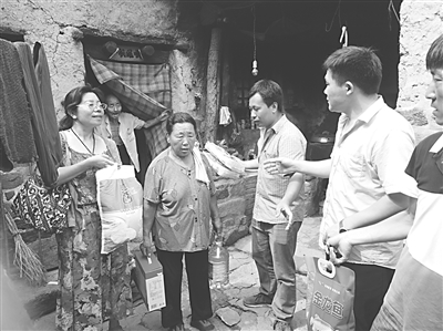 8月4日,本刊和社会爱心人士一起来到受灾较重的赞皇县许亭乡幸福庄村,为该村送去了爱心人士捐助的米、面、油等价值3000多元的基本生活用品,也为受灾群众送上一份爱心。图为本刊编辑和社会爱心人士将物资亲自送到群众家中。 本报记者 刘小林 摄
