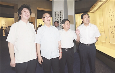 图为李玉成(左二)在唐山中院院长李彦明陪同下参观书画展。
