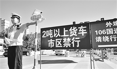 为有效控制细微颗粒物对大气的污染,根据霸州市大气污染治理办公室的要求,霸州市交警大队积极参与大气治理工作,对城区道路实行交通管制,在主要路段设立24小时执勤卡点,对重污染的渣土车、砂石车、建筑垃圾车、无标车、两吨以上货车、低速农用车、黄标车等引导其绕行,避免对城市大气的污染。图为执勤民警正在指挥引导车辆绕行。 本报记者 田宪忠 摄