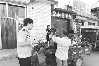 为提升辖区群众消防安全意识,有效预防和遏制火灾事故的发生,新乐市公安局邯邰派出所民警利用周末时间走进辖区集贸市场开展消防知识宣传。图为民警向过往群众发放宣传资料。