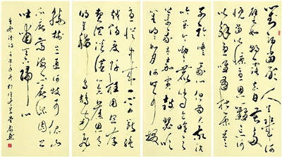 颜默行草对怀素、孙过庭以及王右军等草书借鉴后,追求一种平和、雍容、典雅的气质。颜默草书的线条不强调张力的外显以及锋芒的展现,也不以字态的夸张变形为能事,恪守中锋运笔之下的点线,较为严谨规矩的结构,既显现着法度的限定,又散发出不拘于一式、自在书写的气息,这与怀素《小草千字文》、智永《千字文》那种技术特色及境界有些相似。颜默行草书比较注意点线变化,比如线的粗细、润枯、行笔缓急、笔势驰张等等,这些细节因素既可看作草书通篇的节奏点,也为作品增添了视觉观感上的丰富性。颜默的草书也并未被传统小草的规矩法度所牢笼,比如他在每幅作品中适当将数组单字相连缀,或是加入几处长尾笔等等,于小草体中融入大草延绵、贯通之意趣,进一步强化了作品的形式感。他试图将晋人草书和唐人草书糅融贯通,力求形成一种兼具晋唐草书精华的艺术风格。