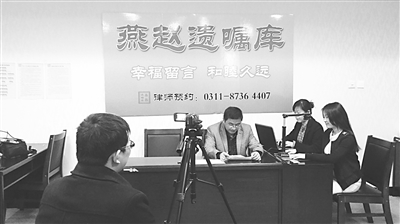 燕赵遗嘱库发起人、河北盈华律师事务所律师王亚琼介绍,办理人首先要宣读经过修改最终定稿的遗嘱,接着在指纹采集器上按下指纹,签上字并按上了手印。“一台摄像机以视频形式记录办理人写字的状态,另一台摄像机记录下整个办理过程。”王亚琼说,他们会为订立遗嘱的老人保存三份遗嘱,包括一份老人的自书遗嘱,一份经过工作人员见证的遗嘱,还有一份影像遗嘱。