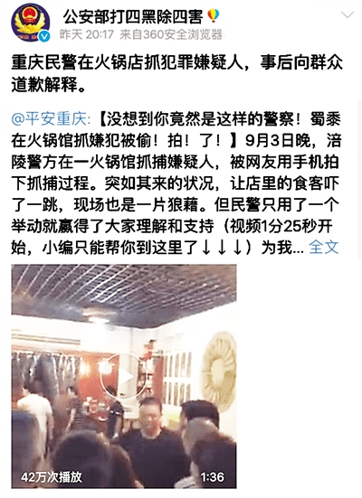 9月3日晚,重庆市涪陵区警方在一家餐馆抓捕一名持刀嫌疑人。抓捕结束后,带队民警不忘向餐馆内的食客解释原因并道歉。视频被发布到网络上后获得大量网友点赞,公安部官方微博也转发了该视频。(9月5日《法治晚报》)