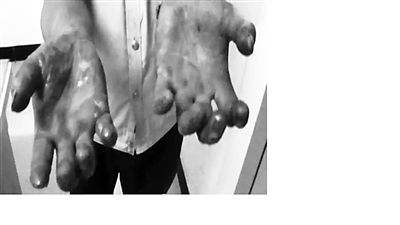 图为白栋元被严重烧伤的双手。 本报记者 刘彬 摄