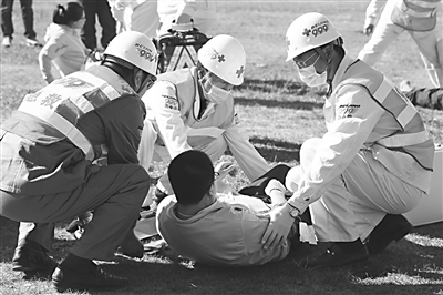 近日,京津冀三省市卫生计生行政部门联合开展2016京津冀重大自然灾害卫生应急综合演练。演练模拟河北省某地发生地震重大自然灾害,致使多个村庄房屋倒塌严重,并造成大量人员伤亡和财产损失。河北省卫生应急救援队率先到达现场,进行初步调查,因灾区情况复杂,请求京津卫生应急队伍增援。京津冀三地立即启动突发事件协同处置机制,组派院前急救、院内救治、卫生防疫、卫生监督、心理干预等卫生应急队伍立即赶赴灾区,开展三地联合卫生应急救援工作。图为演练现场。