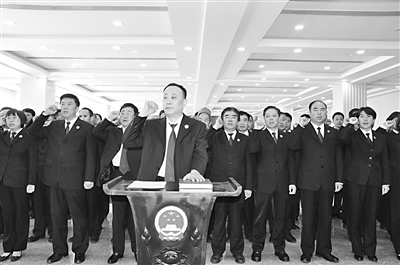“我宣誓:忠于中华人民共和国宪法,维护宪法权威……”10月8日,秦皇岛市人民检察院组织首批入额的56名检察官举行了集体宣誓仪式。 本报记者 桑桂林 摄