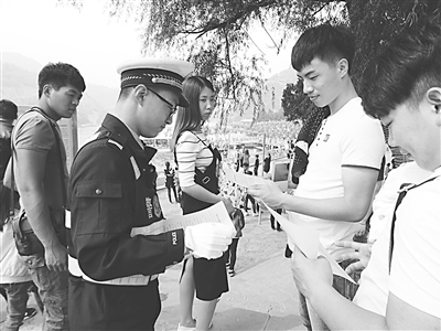 武安市交警大队针对节日期间景区交通出行特点,早研判、早安排、早行动,狠抓路面管控、严查交通违法、强化检查督导,确保了国庆长假安全畅通。图为该大队民警在向游客宣传景区行车注意事项。李换巧 摄