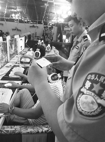 无极县公安局网安大队采取远程网上巡查和现场实地检查相结合方法,对全县网吧开展专项整治行动,对存在问题的网吧,责令业主限期整改。图为10月3日,民警们在网吧里巡查。 本报记者 张哲 摄