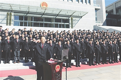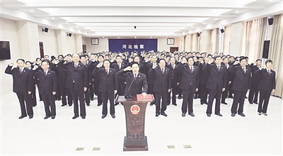 | ▲廊坊市检察院机关入额检察官宪法宣誓仪式上,廊坊市检察院党组书记、检察长冀运福带领入额检察官进行宣誓。 刘东辉 刘巧敏 摄 |
