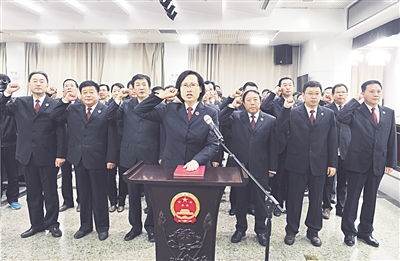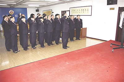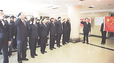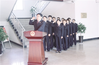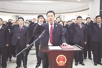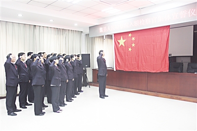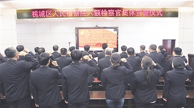 | ▲衡水市桃城区检察院机关入额检察官宪法宣誓仪式上,衡水市检察院党组成员、桃城区检察院检察长张玉书带领入额检察官进行宣誓。 张文英 徐鹏 摄 |