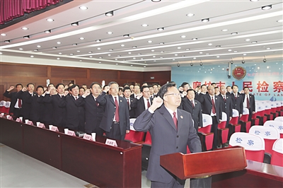 | ▲承德市检察院机关入额检察官宪法宣誓仪式上,承德市检察院党组书记、检察长赵智慧带领入额检察官进行宣誓。 刘向禄 李思科 摄 |