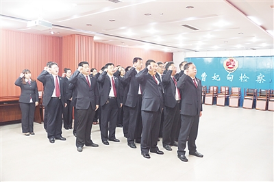 ▲保定市满城区检察院机关入额检察官宪法宣誓仪式上,满城区检察院党组书记、检察长何俊乔带领入额检察官进行宣誓。 李萌 摄 |